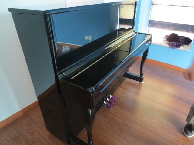 走路時必須注意,鋼琴不能過度傾斜,它與地面的斜度不能超過70度。搬動時,鋼琴背朝墻,鍵盤朝樓梯扶手。二個在下,三個在上,最好用寬布條背在肩上搭著鋼琴的車腳。與此同時,雙手抓住琴背的手柄和鍵盤下面(不能拉鋼琴的腿),將鋼琴抬起,一鼓作氣移到地面,然后休息。尤其注意,鍵盤的一側不要碰扶手,腳不要碰樓梯。拐彎到第一個樓層的時候要小心碰撞,調整好方向后再抬起向上。進入房間時,還要小心擦拭門框,確保最后將鋼琴安全地放在已安排好的位置。